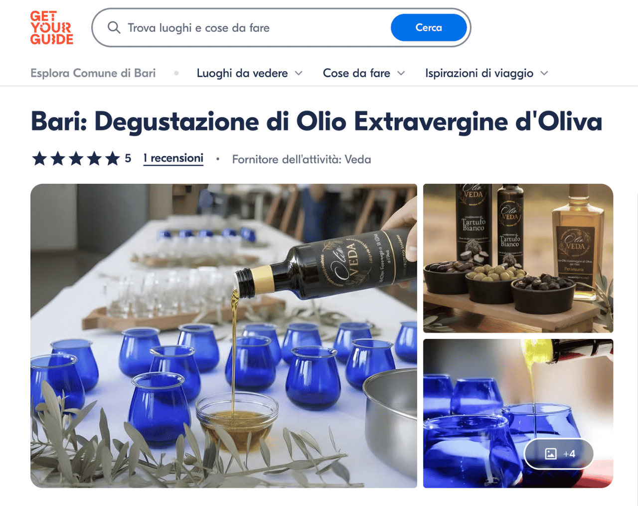 Non ci limitiamo a produrre un olio extravergine di alta qualità: vogliamo farti vivere un’esperienza autentica, tra profumi, sapori e racconti di Puglia. Durante le nostre degustazioni guidate, potrai conoscere da vicino il processo di produzione, imparare a riconoscere un vero olio extravergine e assaporare le nostre diverse varietà in abbinamento a prodotti locali. Siamo su GetYourGuide, la più grande piattaforma di esperienze al mondo — prenota la tua degustazione direttamente online e vieni a scoprire come nasce il gusto unico dell’Olio Veda.